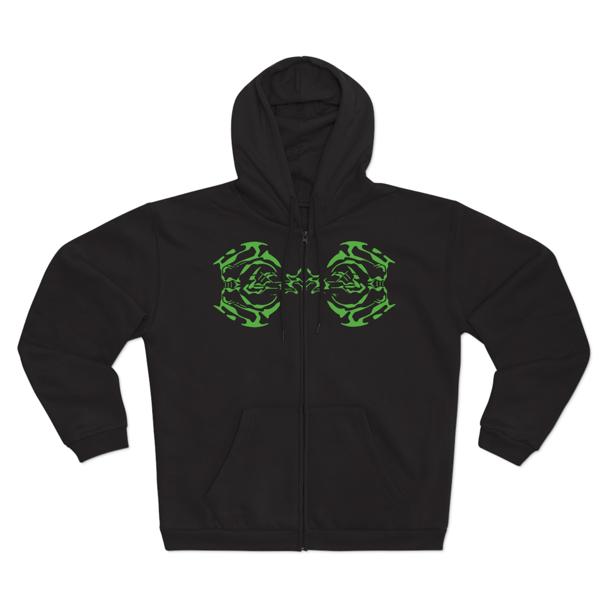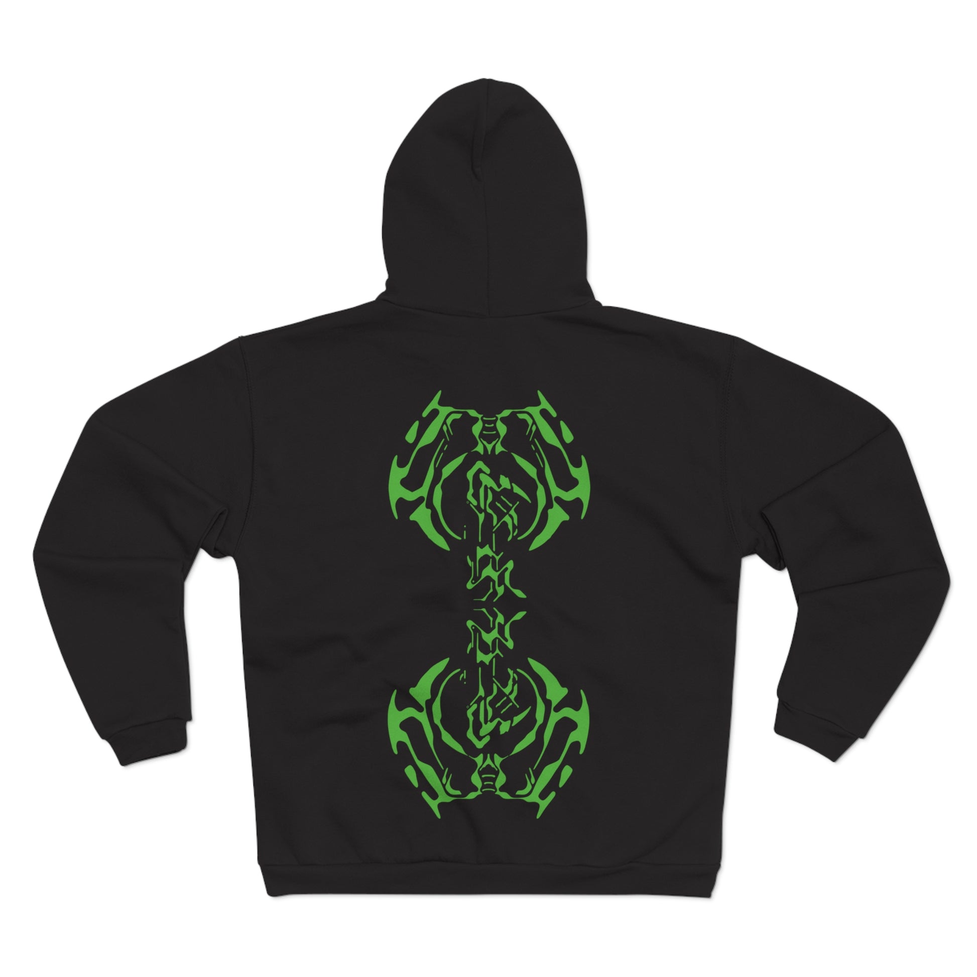 This heavyweight zip hoodie channels late-night street energy and underground art vibes. The bold neon-green tribal motif centers on the chest and runs down the back, like a totem pulled from graffiti and synthwave—raw, rhythmic, and unapologetic. Slip it on when the city hums, when you’re heading to a show, or when you want a layer that reads as armor and artwork at once. The brushed fleece interior and roomy kangaroo pocket keep you warm between sets or on cool walks home. It wears like a familiar companion: breaks in, holds shape, and keeps that graphic front-and-center so your style feels intentional, not accidental.